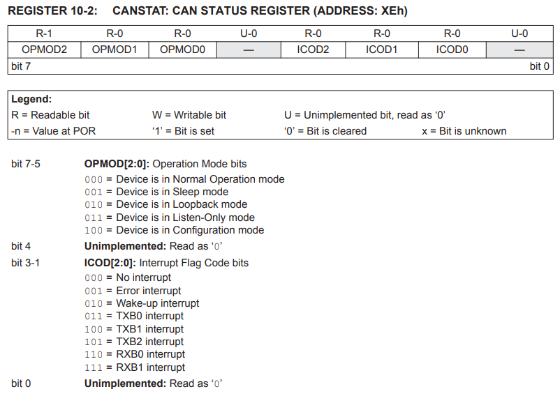 After resetting, the CANCTRL and CANSTAT registers were read respectively. When resetting and entering the configuration mode, CANCTRL was 0x87 and CANSTAT was 0x80. The bit definitions of the two registers are as follows: