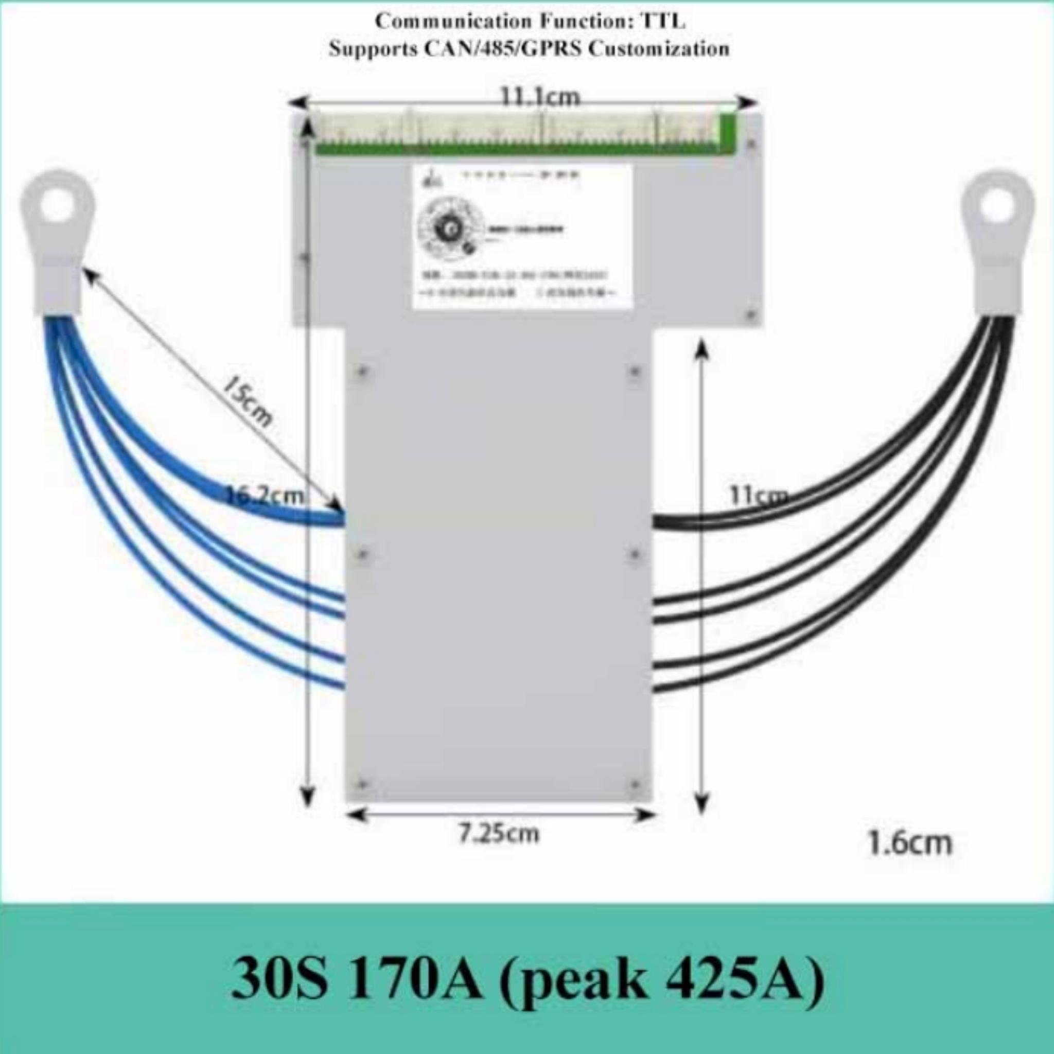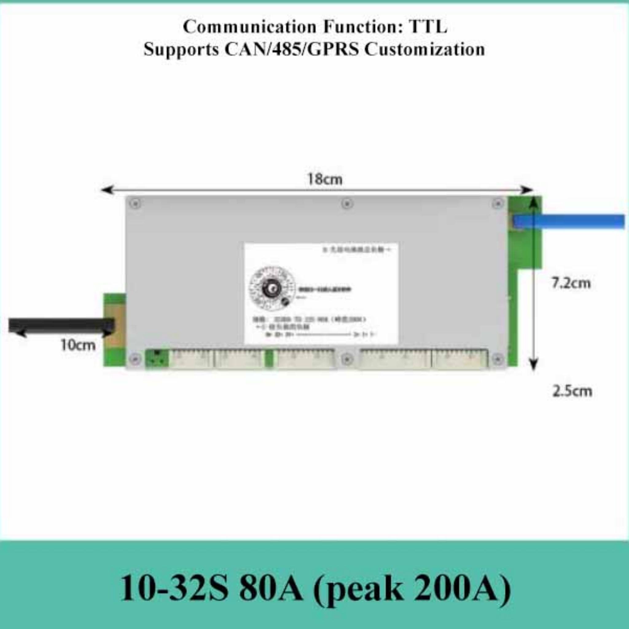 The 80A intelligent BMS equipped with a comprehensive range of functions. These functions include cell voltage detection, temperature detection, and high-voltage detection for real-time monitoring of battery status; battery balancing to ensure consistent performance across battery cells; customizable communication interfaces supporting CAN (Controller Area Network), 485, and TTL (Transistor-Transistor Logic) protocols to adapt to diverse application scenarios; GPRS and Bluetooth connectivity (with mobile APP compatibility) for remote data transmission and user interaction; sleep-wake-up control and delayed power-off features for energy conservation and operational safety; State of Charge (SOC) estimation to accurately assess remaining battery capacity; and MOSFET control for precise regulation of battery charging, discharging, and overall operation.