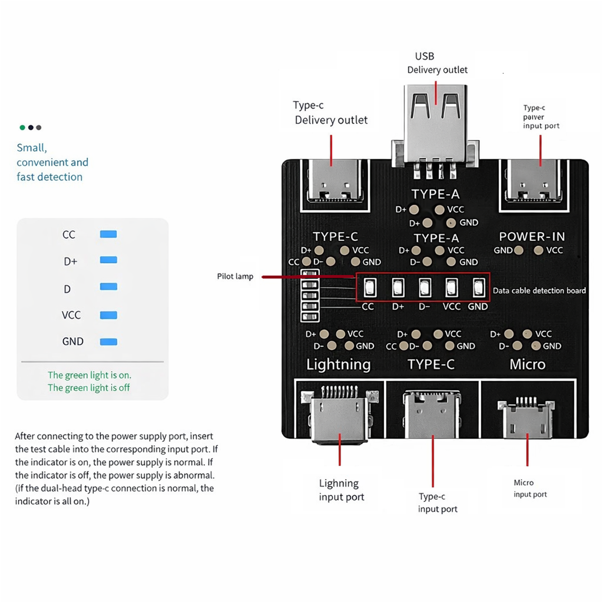 5.Double head type-c data line detection: CC light: It is specially used for the detection of double-headed type-c data line. If it is not on, it is abnormal. When detecting other data lines, the light will not activate.