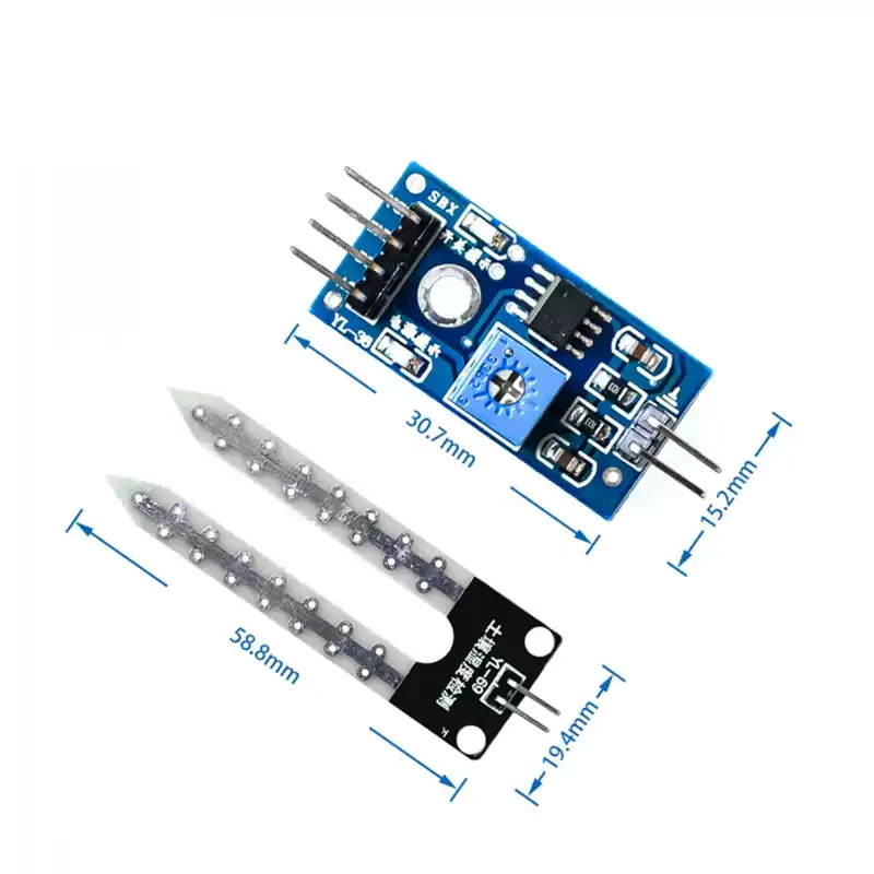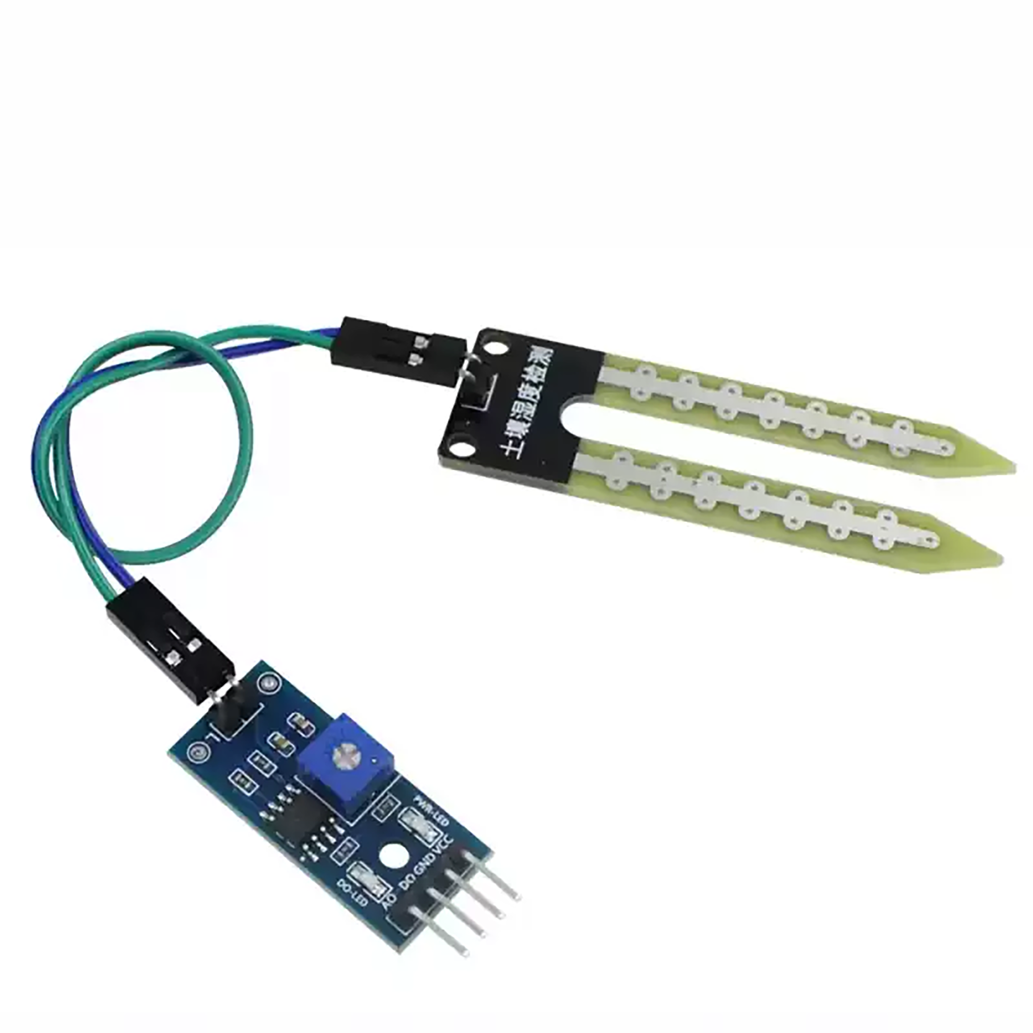The FC-28 soil moisture sensor is a humidity detection module used for measuring the moisture content of soil and similar materials. This soil moisture sensor is very easy to use. It consists of two large exposed electrodes serving as the sensor's probe and a voltage comparator. The two exposed electrodes form a resistor. The more moisture there is in the soil, the better the conductivity between the electrodes, and the lower the resistance value will be.