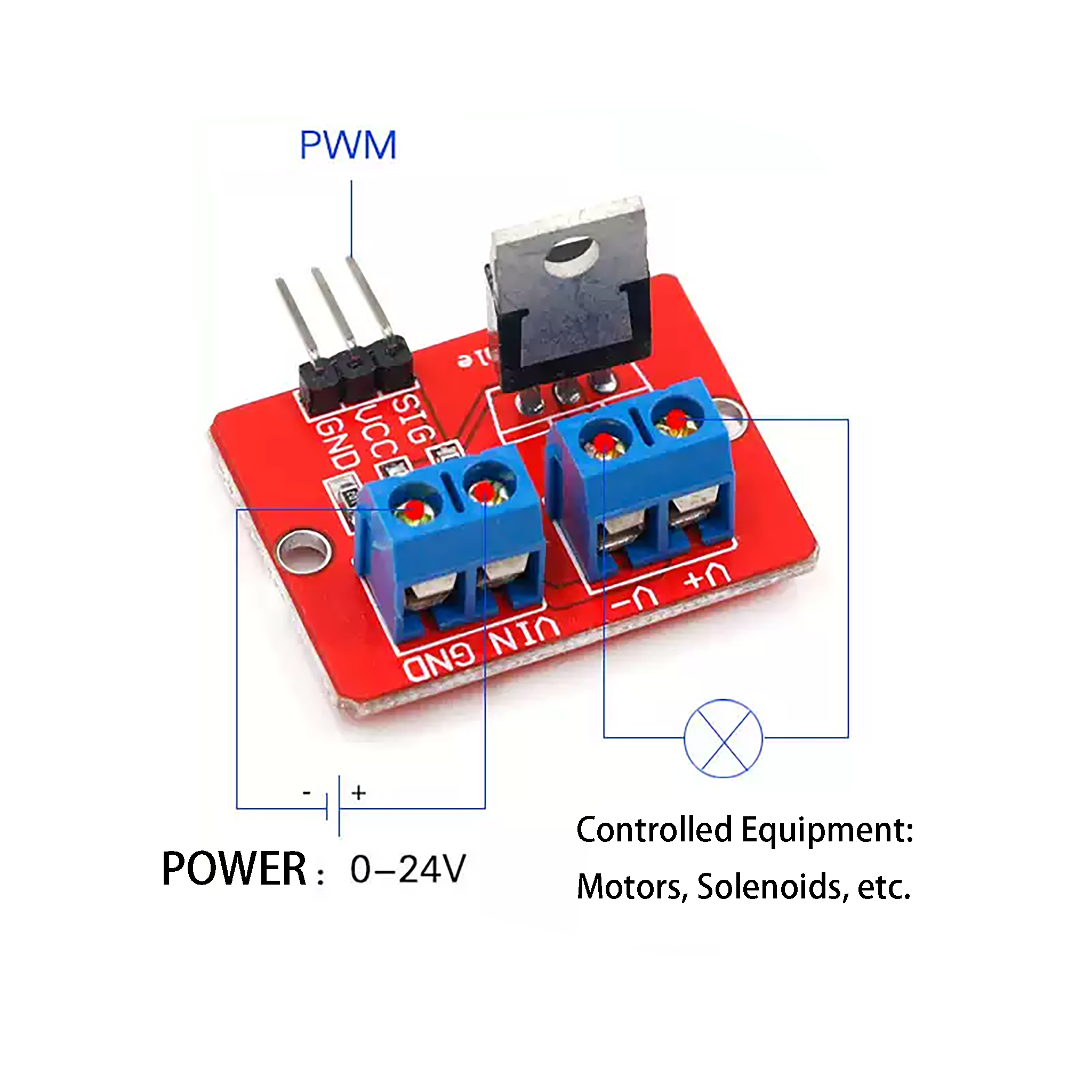 - When the PWM signal is high(3.3V-5.0V):The voltage between V+ and V- equals the power supply voltage, the working indicator light turns on, and the load operates.