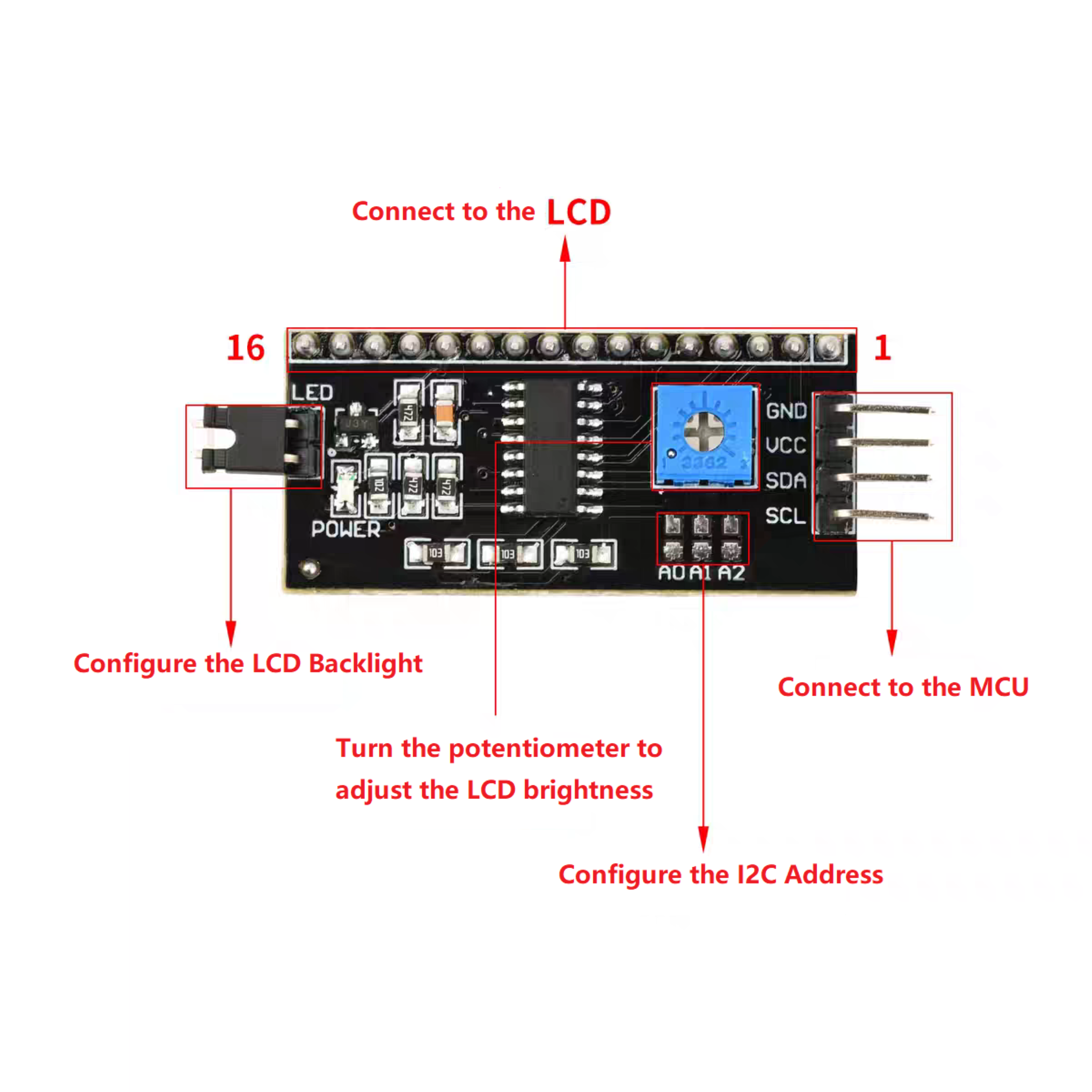 | (Blue Potentiometer) | Contrast Adjustment | Built-in Adjustment | Rotate Clockwise/Counterclockwise to Adjust Display Contrast |