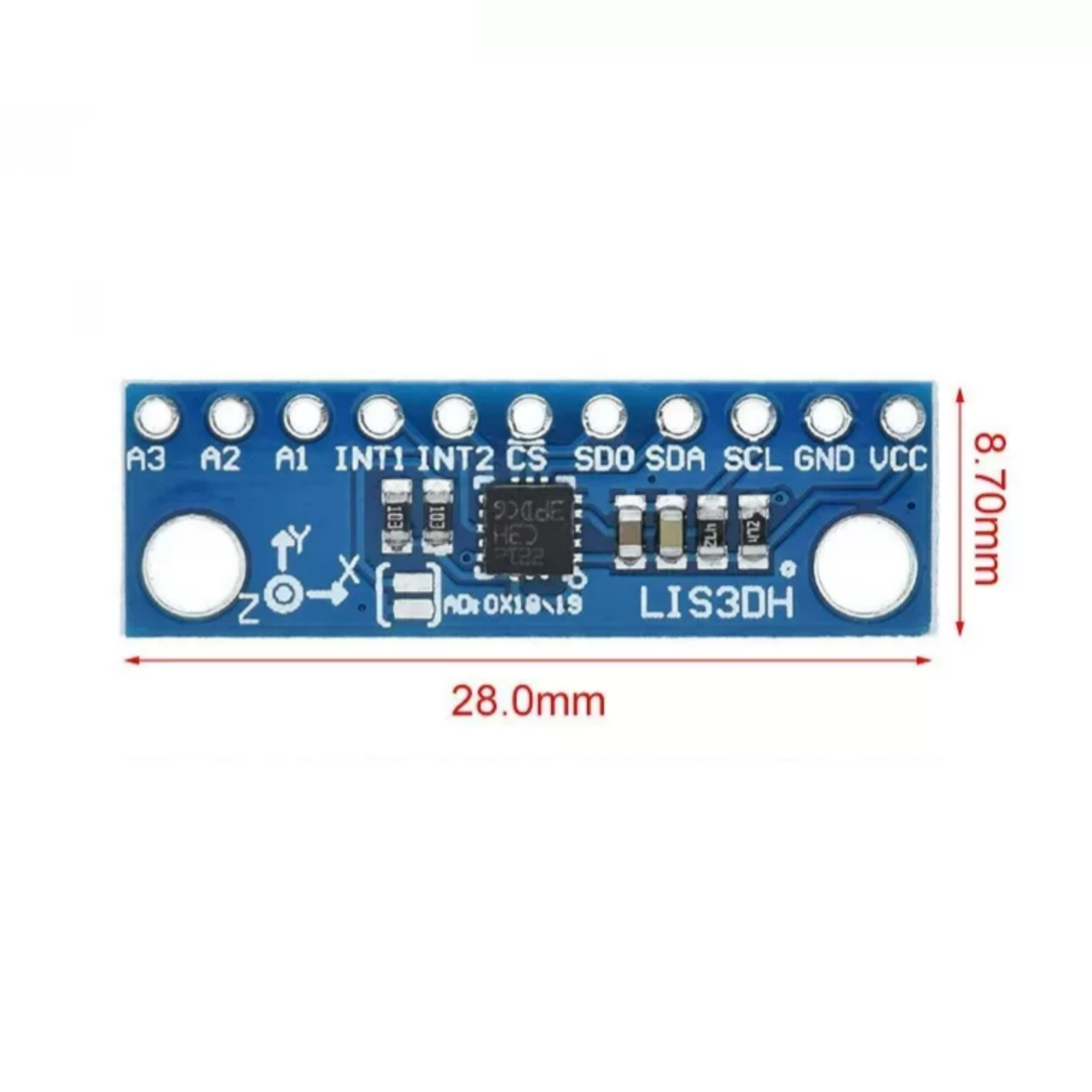 This accelerometer module is based on the LIS3DH (note: the text mentions “LISDH” which is likely a typo for LIS3DH) MEMS 3-axis accelerometer chip produced by STMicroelectronics. It is an intelligent, low-power, 3-axis, capacitive micro-mechanical accelerometer module with 12-bit resolution, capable of realizing motion sensing functions.