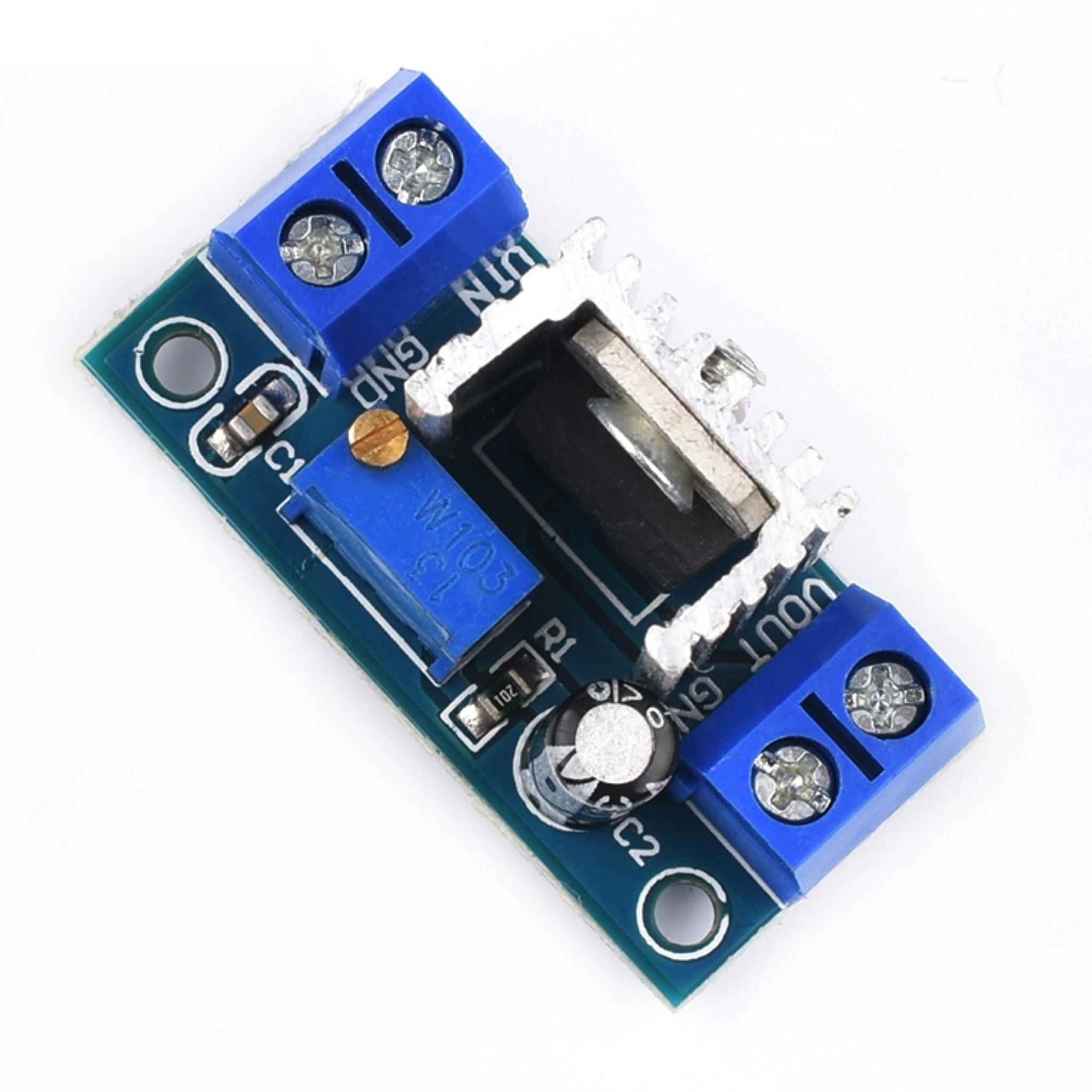 This module can replace all fixed 3-terminal regulators like the 7805, 7806, 7809, 7812, and 7824. It also works as a car-mounted power supply: just connect the module’s input to your car’s cigarette lighter port, then turn the potentiometer to adjust the output voltage (from 1.25V to 30V) — it can power devices like phones, MP3s, MP4s, and PSPs, making it super simple and convenient.