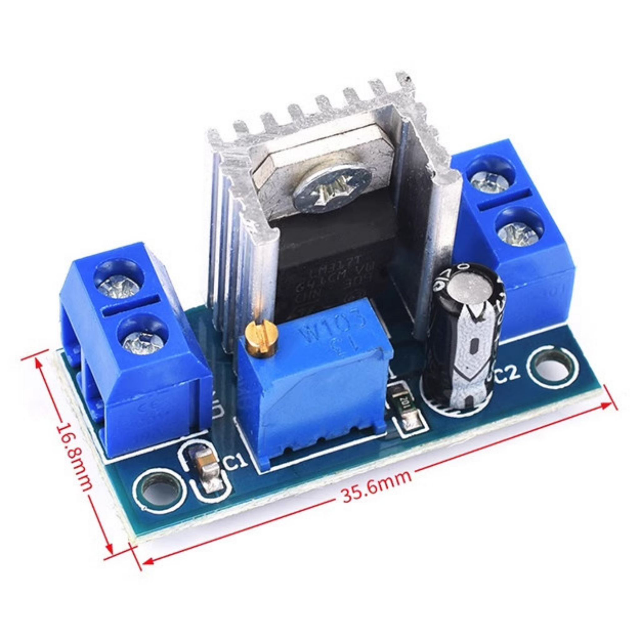 This is LM317 adjustable regulated power supply board that uses a linear voltage regulator. Since it’s linear, its efficiency isn’t extremely high — to boost efficiency, there needs to be a 3V voltage difference between input and output. However, the maximum voltage difference between input and output should not exceed 30V.