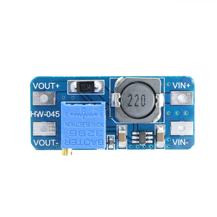 It has an SX1308 chip inside. It features small package, high efficiency, and adjustable output voltage. It integrates a metal-oxide-semiconductor field-effect transistor with extremely low RDS on-resistance of 100mΩ, which can achieve large current output within 2A.