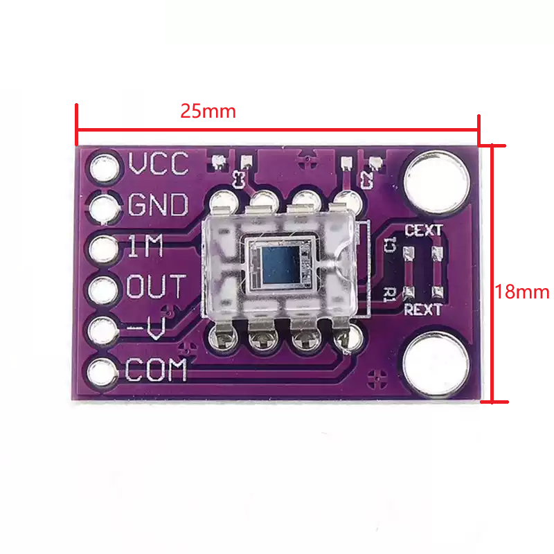 OPT101 Pinout: ①VCC: +2.7V – 36V ②GND: Ground ③1M: 1MΩ Resistor ④OUT: ADC ⑤-V: Ground or Vcc- ⑥COM:Ground
