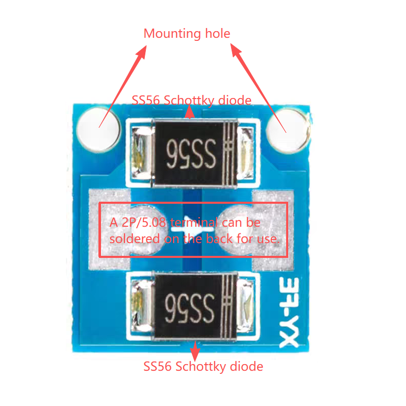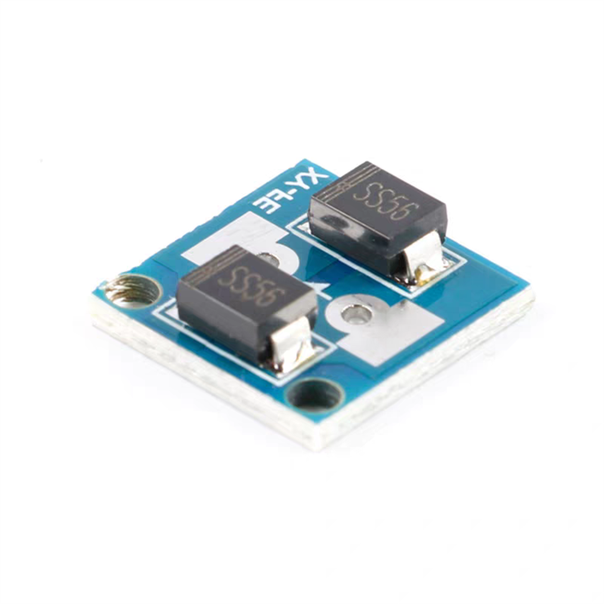 Uses two SS56 Schottky diodes in parallel for low internal resistance and low voltage drop. Maximum current: 10A, withstand voltage: 60V.