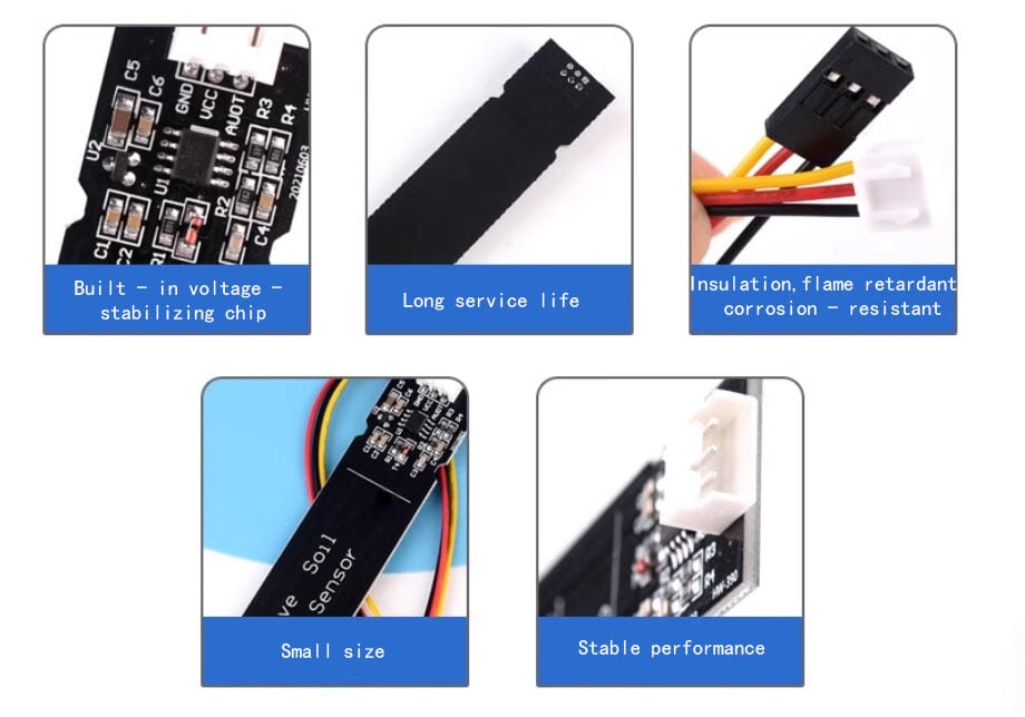 Different from most resistive sensors available on the market, this capacitive soil moisture sensor adopts the principle of capacitive sensing to detect soil moisture. It avoids the problem that resistive sensors are extremely prone to corrosion, thus greatly extending its service life. The sensor has a built-in voltage regulator chip and supports a wide voltage working environment of 3.3~5.5V, which means it can work normally even on a 3.3V ARDUINO main control board. For micro PCs like Raspberry Pi, it can work only by connecting an external ADC (Analog to Digital Converter) module.