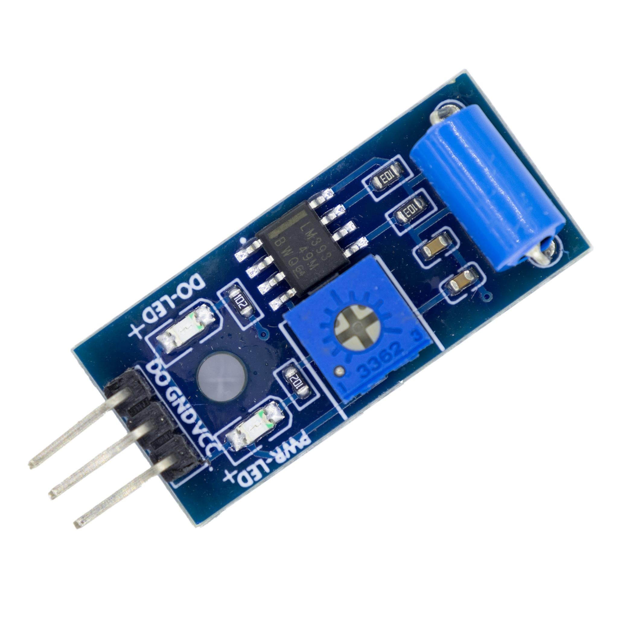 2. When the power supply is normal, both the two LED lights are on, and the DO pin outputs a low level. When the sensor is tapped, the DO-LED light goes off, and the DO pin outputs a high level.