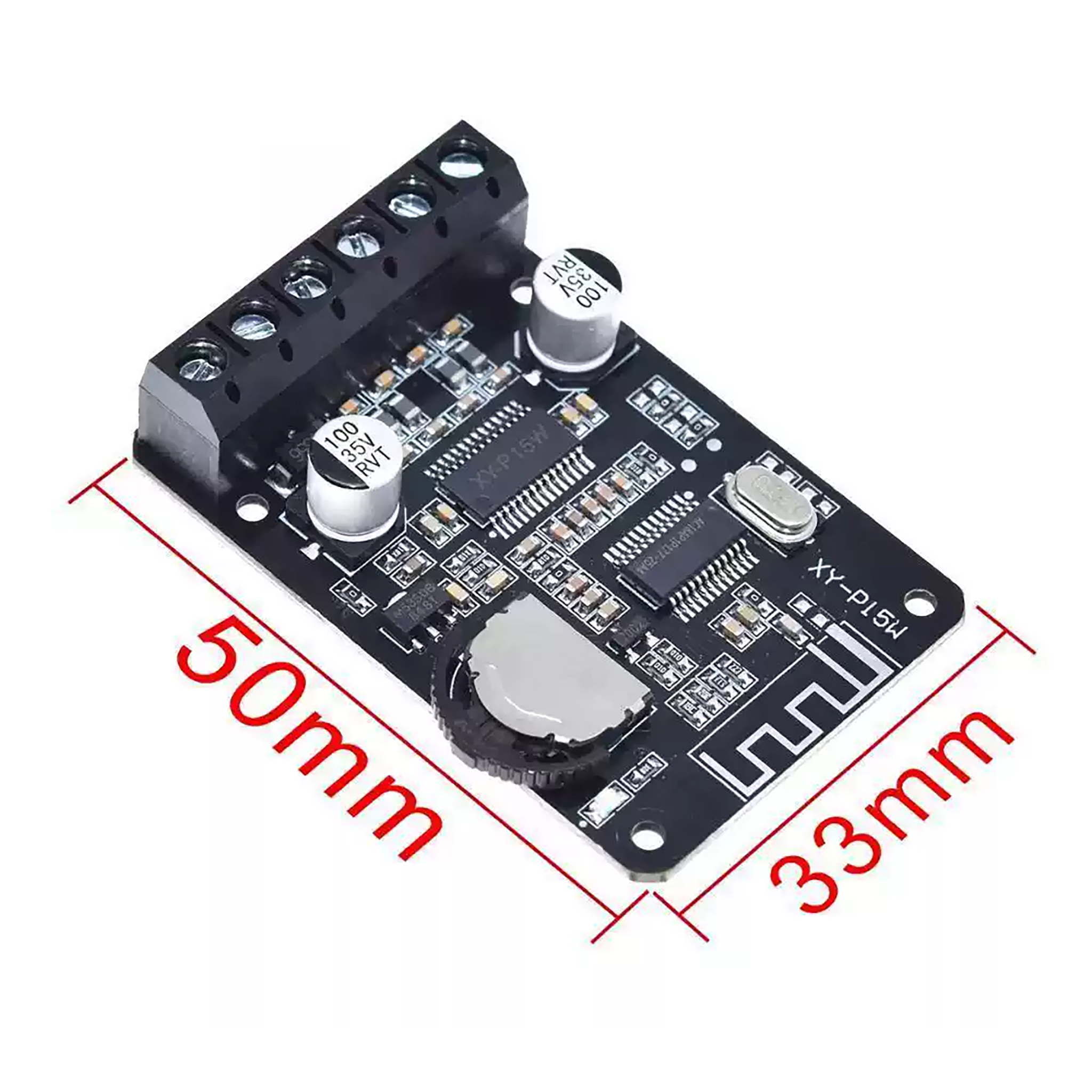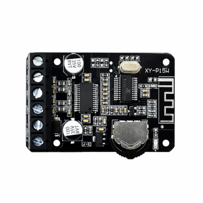 The XY-P15 stereo Bluetooth power amplifier board is a module for playing audio from mobile phones or other devices via Bluetooth. Just supply external power, pair your Bluetooth device, connect two speakers (placed left and right), and enjoy stereo sound.