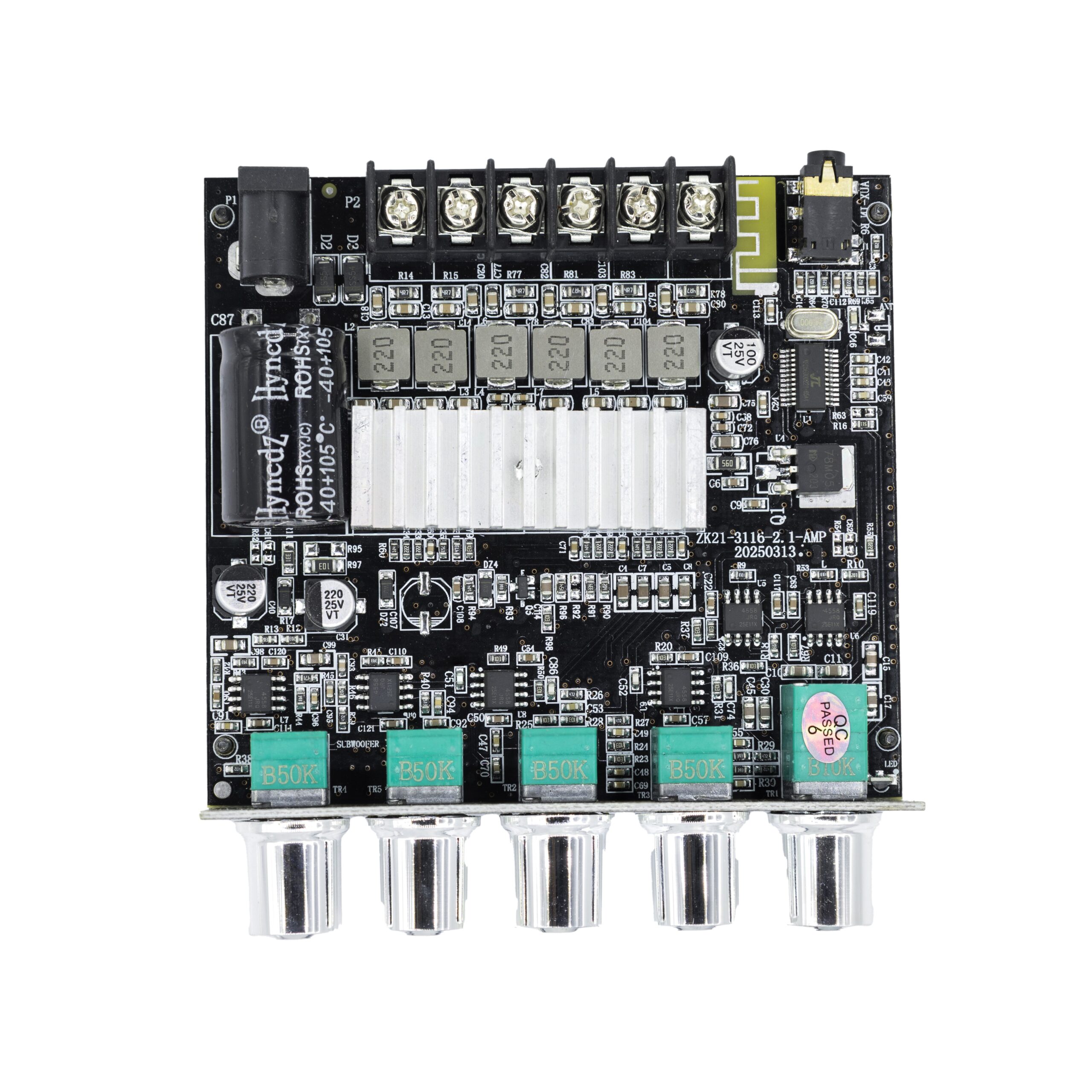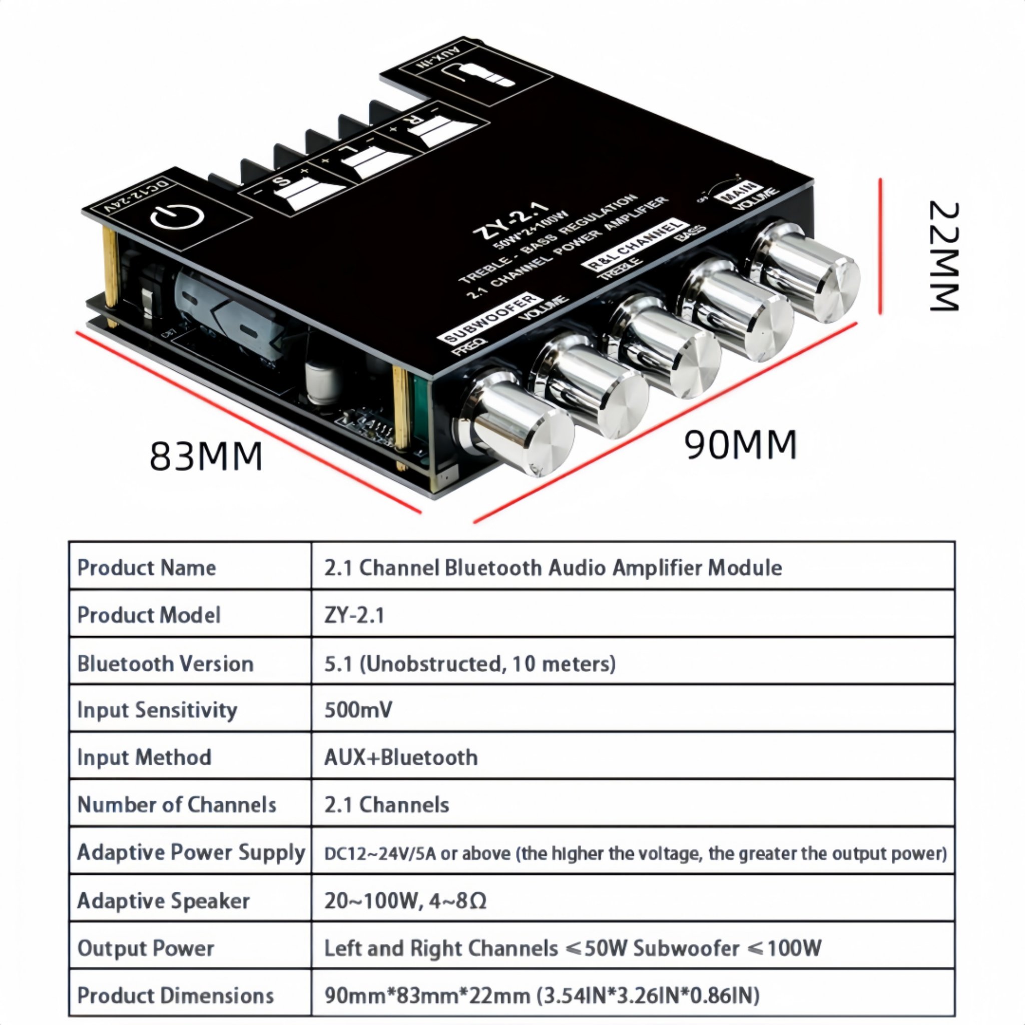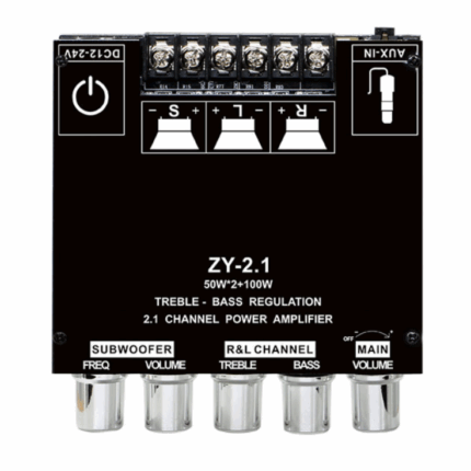 The ZY-2.1BT Bluetooth Amplifier Board is a high-performance audio solution that combines powerful output with versatile connectivity. Operating on DC 12-24V power supply, it delivers robust 50W+50W stereo channels and an impressive 100W dedicated subwoofer output, perfectly driving 4-8Ω speakers ranging from 15-100W. With dual audio input options including Bluetooth 5.1 and AUX interface, it seamlessly connects to your devices whether you prefer wireless streaming or wired connections. Ideal for home theaters, car audio systems, and party setups, this amplifier brings professional-grade sound quality to your everyday audio experience without any complicated installation.