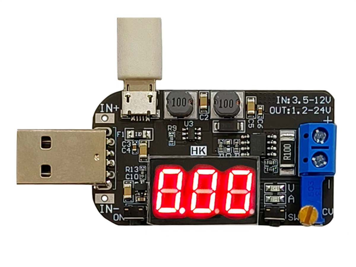 The output voltage can be adjusted from DC 1.2V to 24V using the onboard CV potentiometer, depending on the input voltage and load conditions.